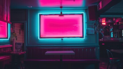 Vibrant neon reflections on a sleek bar surface, illuminated by colorful lights