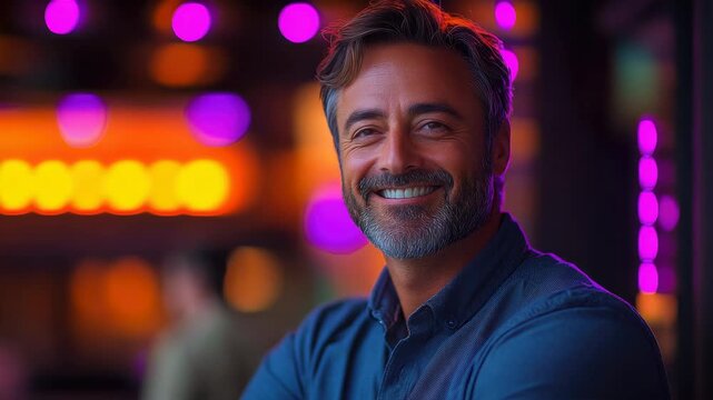 Stylish Security Guard Overseeing Upscale Nightclub Ambiance with Vibrant Neon Lighting and Contemporary Interiors