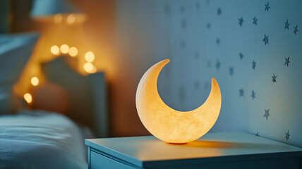 Crescent moon nightlight on a nightstand in a cozy bedroom