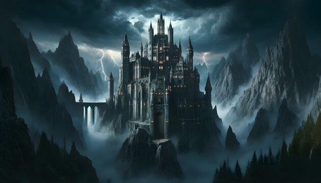 A terrifying castle perched on a rocky cliff, surrounded by lightning storms and dark, foreboding mountains, exuding a horrific and menacing presence.