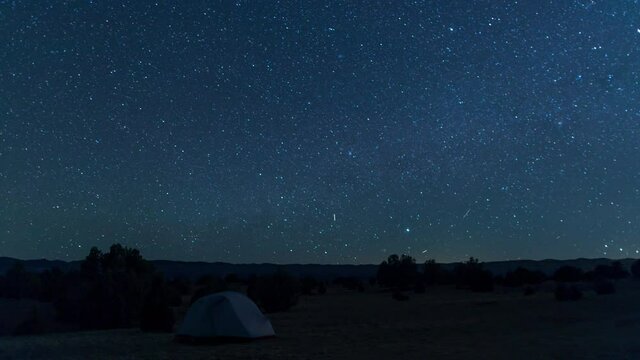 A night-to-day time-lapse of a tent under a star-filled night sky in the Grand Staircase-Escalante National Monument a few miles south of the town of Escalante, Utah.