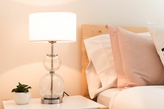 Beautiful lit lamp with a small plant on a nightstand next to the bed
