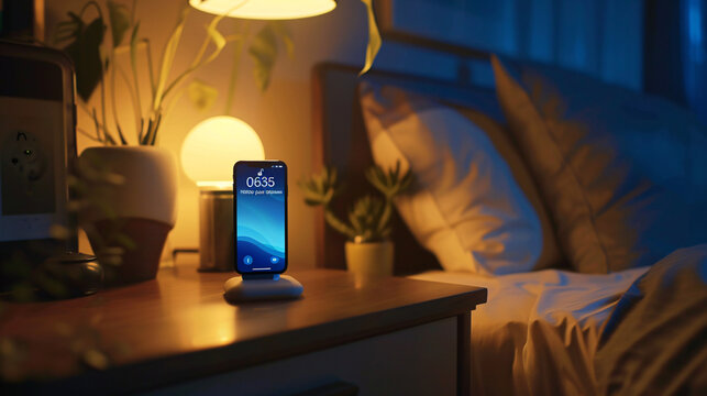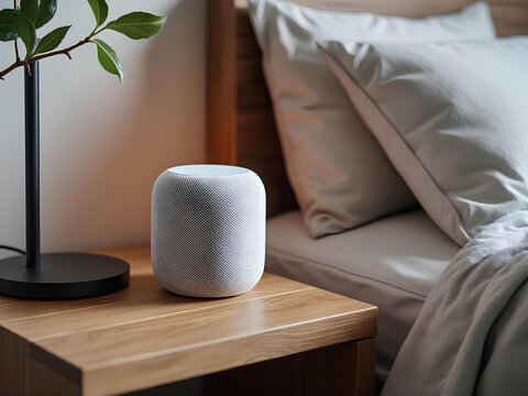 Smart home assistant placed on a nightstand beside a bed in a modern bedroom, future advance home