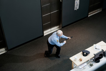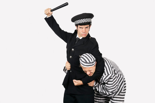 Portrait of police officer with nightstick arresting male prisoner against gray background