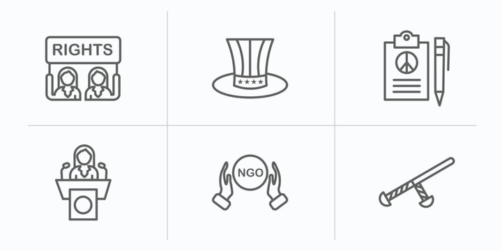 political outline icons set. thin line icons such as women rights, uncle sam hat, peace treaty, politicians, ngo, nightstick vector.