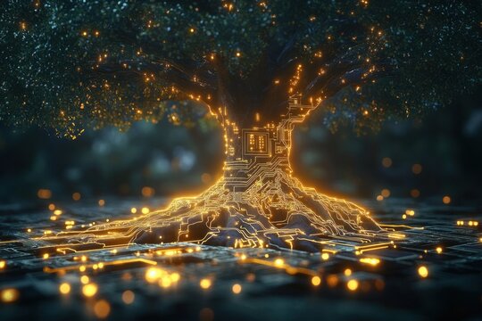 A large tree with glowing golden circuit-like patterns running along its trunk and roots, blending nature with futuristic technology in a serene nighttime setting