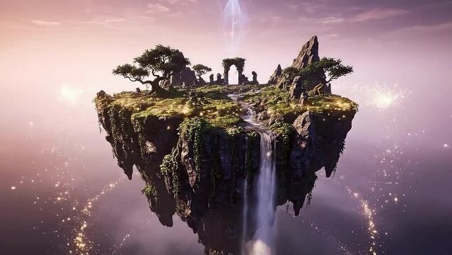 a floating mini island with glowing particle waves, hills trees and a run ning waterfall