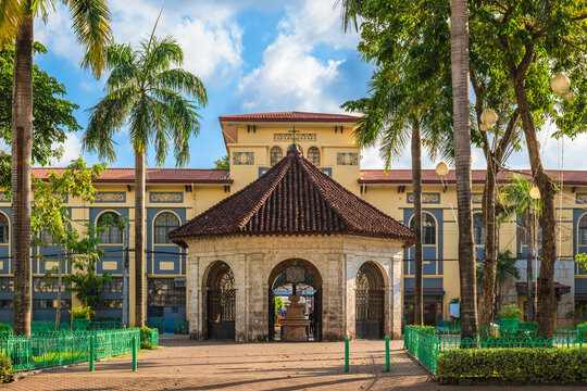 Jesus Christ Crucifixion on Cross and Saint Statues on altar at Basilica Minore del Santo Nino, the oldest church in the Philippines. Built in 1565 by Spanish colonists.