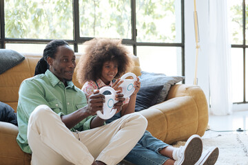 Dad and her daughter playing video games with a steering wheel at home