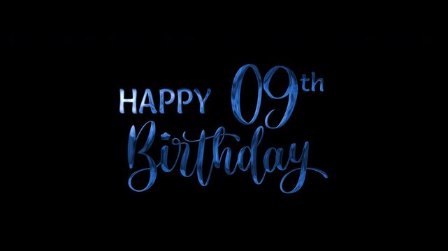 9th happy birthday text animation in blue metallic effect. suitable for birthday celebrations, social media posts, and greeting cards. Includes alpha channel for any background.