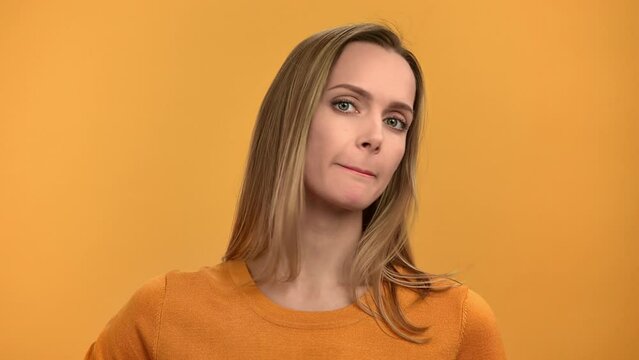 Closeup portrait blonde woman annoyed face expression shaking forefinger no not dont want gesture