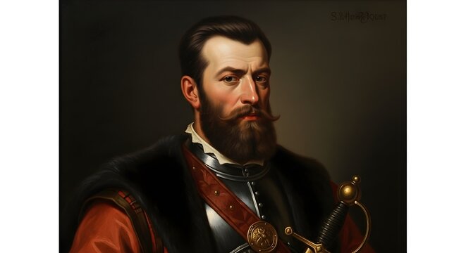 Classic oil painting style portrait of a dignified bearded nobleman in medieval or Renaissance armor with a sword
