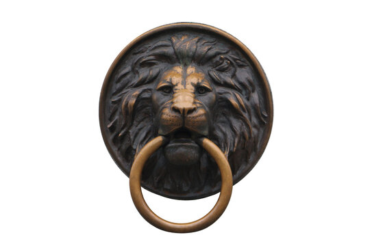 Metal decorative head of a lion with a ring in the teeth. Isolated on white background.
