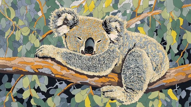 A depiction of a koala lounging atop a tree limb with its noggin propped against another branch
