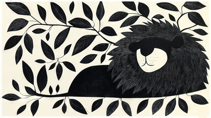 A monochromatic depiction of a feline lounging on a treetop with its noggin atop another branch