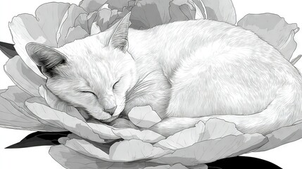 A monochromatic depiction of a feline slumbering atop a blossom, with its noggin poised at the petal's terminus