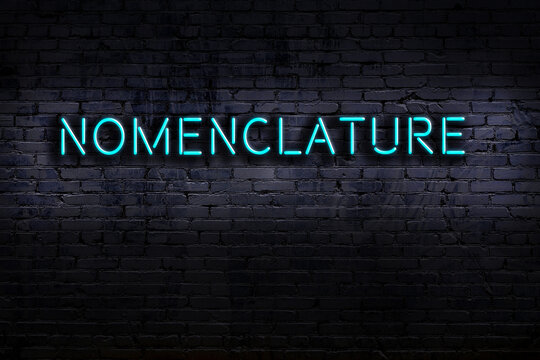 Night view of neon sign on brick wall with inscription nomenclature
