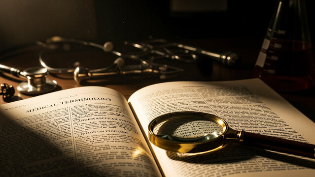 Close look at medical terminology in an open book with vintage science equipment