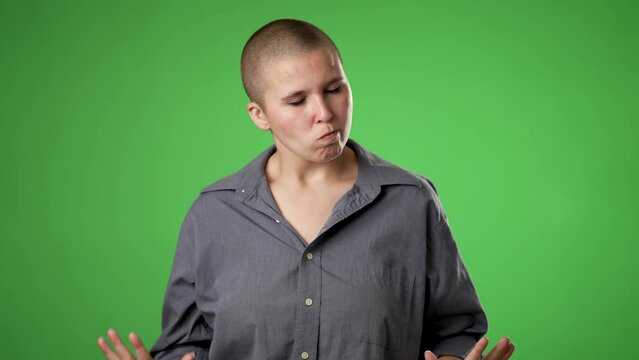 Portrait of angry frustrated despair upset portrait of gender fluid non binary young woman 20s closeup slow motion isolated on green screen background