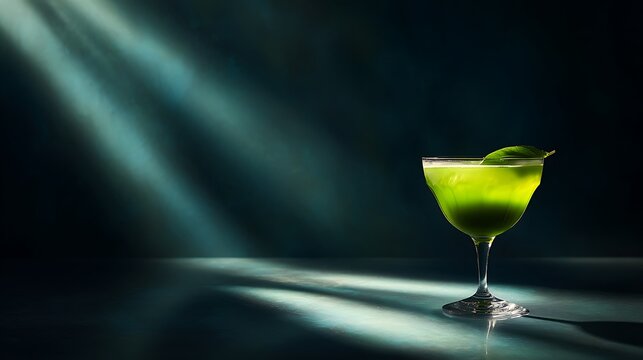 Artfully Crafted Refreshing Green Cocktail Served in Elegant Glassware Under Dramatic Spotlight