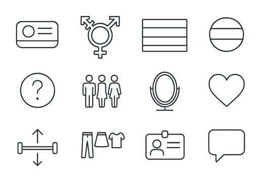 Gender Identity Icons. Outline icon set of gender identity: pronoun badge, transgender symbol, non-binary flag