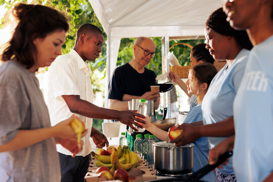 Diverse group of female volunteers donate free food to the poor and homeless people. Voluntary ladies offer refreshment and aid to those in need supporting a food drive for a non-profit organization.