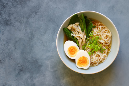 Udon noodles with baby bok choy and shiitake mushrooms. Asian vegetarian cuisine. ai generative