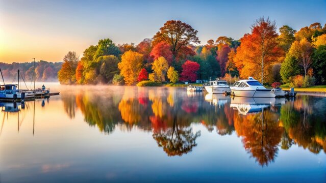 vibrant autumn colors lake norman nc fall foliage reflection symmetry calm peaceful morning misty fog boats docked nature landscape photography
