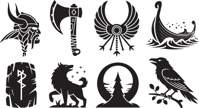 Viking and Norse Mythology Symbols Collection Featuring Runes, Wolf, Raven, and Ship