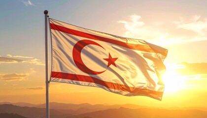 Stunning golden sunset illuminates the flag of Northern Cyprus waving proudly above the mountain range, symbolizing national pride and beauty