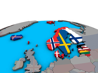 Northern Europe with embedded national flags on political 3D globe.