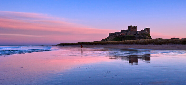 Sunset on Bamburgh Castle, on the northeast coast of England, by the village of Bamburgh in Northumberland