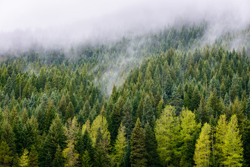 Fog cover the forest. Misty forest view from Larch Mount. USA Pacific Northwest, Oregon.
