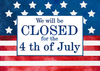 Signboard with the inscription We will be closed for the 4th of July and a watercolor drawing of the American Flag. Closeup, no people. Congratulations for family, relatives, friends. vector . EPS 10