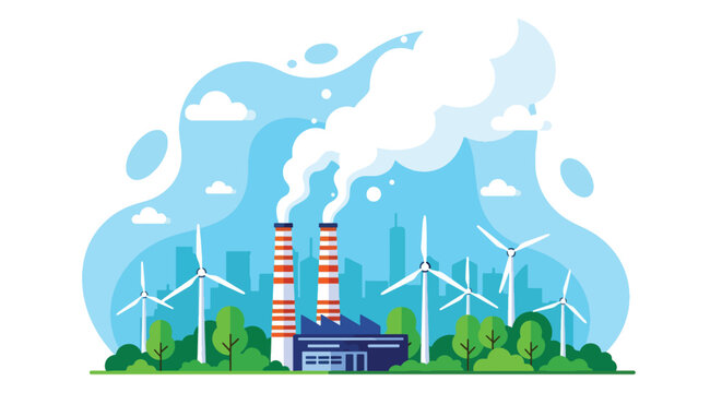 Flat vector illustration of eco factory with clean vapor chimneys, trees, wind turbines, and sustainability icons. Solid colors only, no gradients, emission-free industrial concept