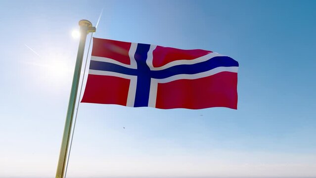 Flag of Norway waving in the wind, sky and sun background. Norway Flag. Ultra Hd.