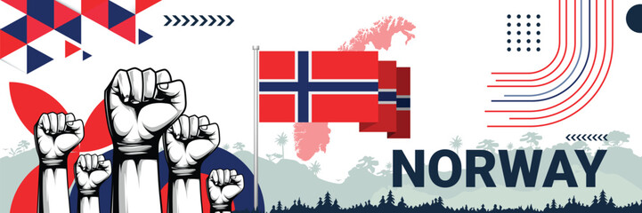 Banner illustration of Norway independence day celebration with text space. Waving flag and hands clenched. Vector illustration.