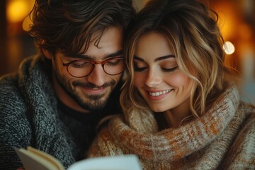 couple reading heartfelt birthday wishes cozy home setting warm lighting intimate moment genuine smiles nostalgic card design soft focus muted colors emotional connection captured