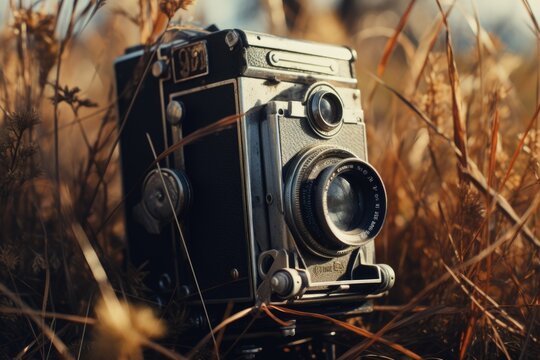 An old camera sitting in the middle of a field. Perfect for photography enthusiasts or nostalgic themes