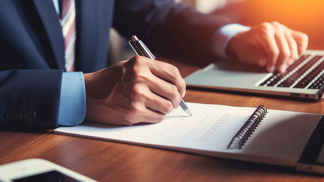 The entrepreneur employs a pen to create a notation on the booking schedule. Generative AI