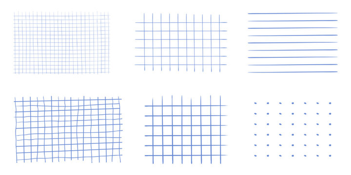 Graph crayon blue hand drawn textured square grid for note, geometric line texture. Crayon or pencil stripes, dots for bullet journal pages.