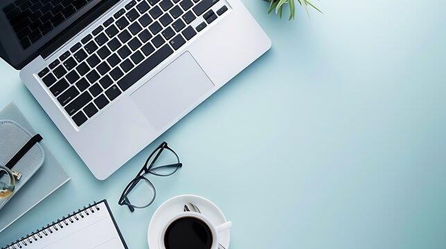 Minimal work space  Creative flat lay photo of workspace desk Top view office desk with laptop notebooks and coffee cup on blue color background Panoramic banner background with copy s : Generative AI