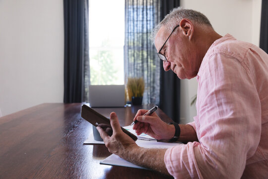 Senior man holding smartphone and writing on notepad at desk with laptop in study, copy space