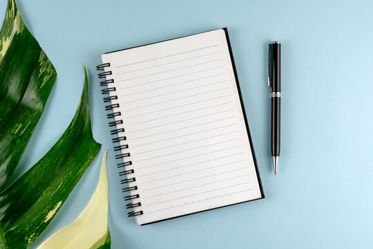 Top view photo of open blue notepad pen and plant on isolated pastel blue background with blank space