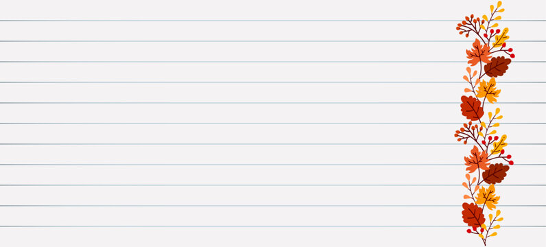 Paper Background with Autumn Leaves,  Lines, Copybook Page, Template, Notepaper, Autumn Border, Autumn Decoration, Vector