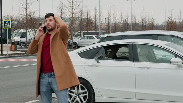 Middle-aged car owner sees broken window calls emergency services crime negative emotions urgent call. Man notices shattered car glass contacts emergency hotline criminal theft immediate response.