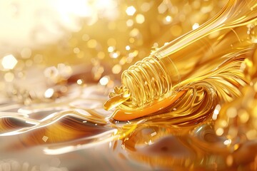 Facial serum bottle with golden liquid splash on light backdrop. Luxury skincare product for face treatment. Hydrating, nourishing beauty cosmetic oil demonstration with bubbles. Promotion of premium