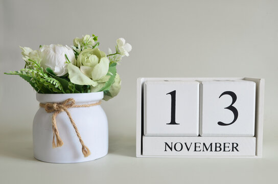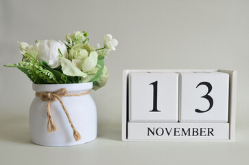 November 13, Cover natural background, white wooden Calendar cube with a pot flower on white background.