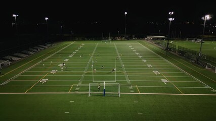 A Stunning Aerial View Of Two Women Soccer Teams Playing Football At Night In Dartmouth, Nova Scotia. The Late-Night Practice Demonstrates The Hard Work And Determination Of Young Athletes.