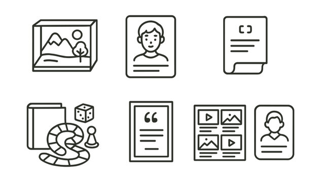 Line style icons of student literary projects: diorama of scene, illustrated character file, script adaptation page, dramatic reading icon, novel board game, quote poster, book trailer storyboards,